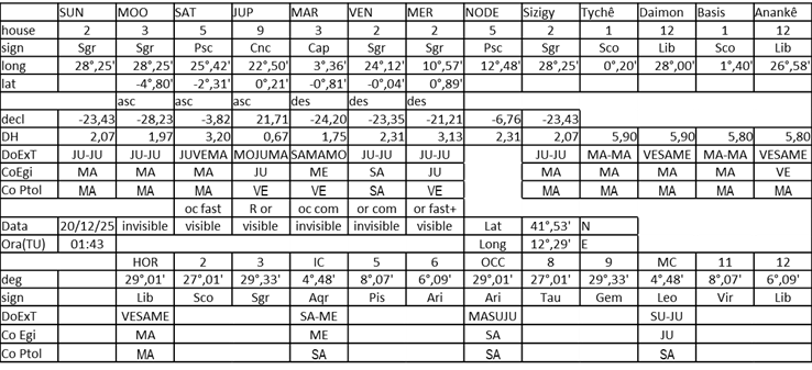 triplicità di Saturno, confini di Marte. All’Oroscopo sorge Aldebaran natura Marte; insieme a Giove c’è Pollux anche lui di natura Marte; al Fondo Cielo c’è Rosalas natura Saturno-Marte; con Mercurio ci sono Arturo