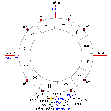 Tuttavia lesame delle stelle mostra una diversa disposizione, contraddicendo in parte quanto sopra enunciato. Betelgeuse, alpha Orionis - natura Marte a causa del suo bel colore rosso-arancio -, si unisce al Fondo Cielo, essendo però anchessa non visibile in quei giorni, e questo rafforza la qualità marziana della stagione. La brillante del Cane Minore, Procione, di natura Marte-Mercurio, unita a Giove, il giorno successivo giunge al suo tramonto eliaco vespertino. E ciò genera calore, tanto che si dice che causi bruciature alle viti in fiore. Circostanza che getta nello sconforto lestensore di queste righe, che ha come unica consolazione il fatto di aver provveduto nel frattempo ad un confortevole rifornimento (di bottiglie intendo, non di viti ). Procione, del resto, pare svolgere un ruolo di primo piano in tutto landamento della stagione, come si vedrà in seguito. Rigel, beta Orionis, natura Giove-Saturno ed El Nath, beta Tauri, natura Marte, si uniscono ai luminari, mostrando così una sia pur minima corruzione delle loro virtù. La Cascata dAcqua dellAcquario sorge alloroscopo e la nebulosa nei pressi del Pungiglione dello Scorpione, M7, culmina al Medio Cielo, cagionando entrambi questi asterismi umidità ed unaria soffocante. I pur interessanti fenomeni astronomici che circondano la sizigia non sembrano invero produrre effetti particolarmente sensibili: l8 giugno Mercurio giunge alla 2ª Stazione, rimanendo ancora invisibile; Mercurio e Venere stanno raggiungendo i propri ventri. Mercurio due giorni dopo il novilunio a 4°10 di latitudine, Venere il 15 giugno a +1°59(!). Li segnaliamo a beneficio dei navigatori interessati alluso nellarte di tali fondamenti. Componendo il giudizio, pur non sottovalutando il potere di Procione e Betelgeuse, nelle sue linee generali lestate si presenta piuttosto temperata, sebbene alcuni periodi manifesteranno una forte calura; lo spirare di venti opportuni provvederà a far scendere la temperatura a livelli più tollerabili in tempi ragionevoli. Ovviamente non mancheranno fenomeni temporaleschi, più frequenti durante il primo mese a partire dalla sizigia, ma mai particolarmente impetuosi o preoccupanti.