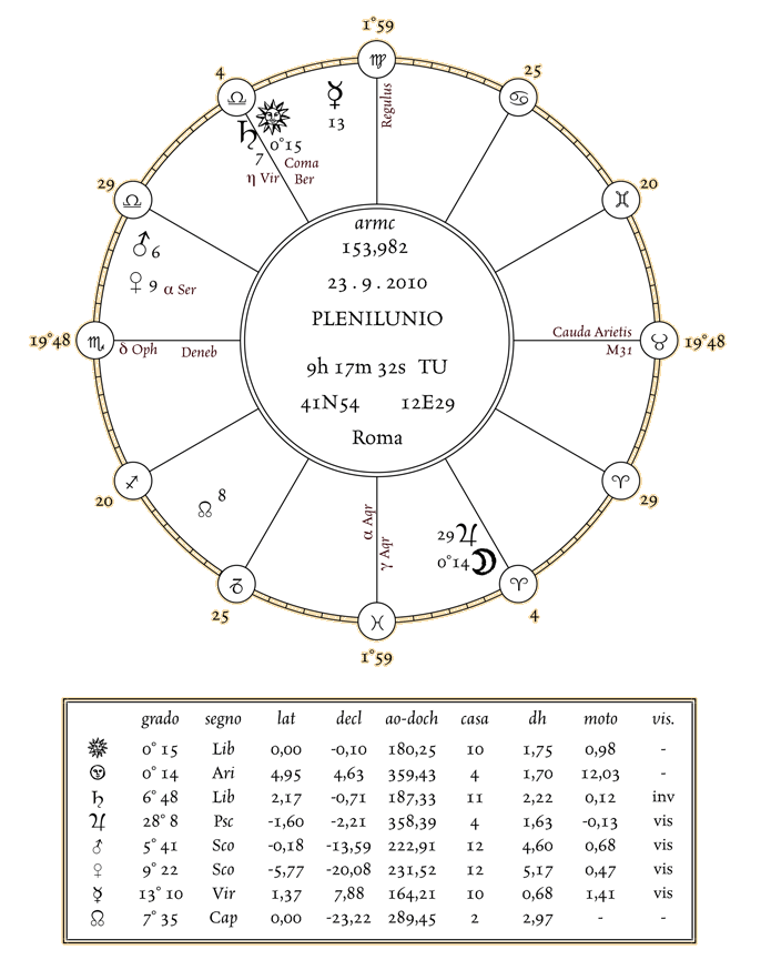 Nel corso della stagione non si verificheranno eclissi solari o lunari e non si ritiene vi siano precedenti eclissi ancora in corso di validità, pertanto procediamo all'esame dettagliato della sizigia plenilunica autunnale.