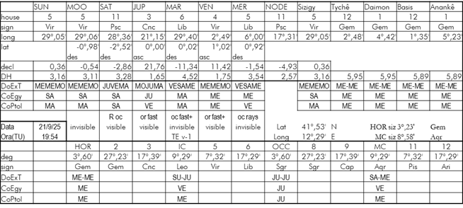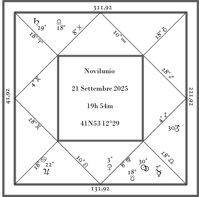 Sole e Luna si uniscono nel quinto luogo all’ultimo grado di Vergine, domicilio ed esaltazione di Mercurio, triplicità di Luna, confini egizi di Saturno e tolemaici di Marte; l’angolo seguente è l’Occidente al quarto grado del Sagittario dove tutte le dignità sono di Giove. Il Sole ha un’opposizione molto precisa con Saturno eclittica e mondana, ha poi un esagono con Giove ed è congiunto con Mercurio col quale ha pure un antiparallelo di declinazione, ma questi aspetti sono in separazione. Saturno è retrogrado, visibile e occidentale e ciò aumenta la sua naturale secchezza; Giove e Venere sono orientali e di moto veloce quindi più umidi; Marte è occidentale quindi più secco, di moto veloce, nel primo giorno di invisibilità dopo la fase di tramonto eliaco vespertino e questa condizione lo raffredda; Mercurio è occidentale e invisibile. La Luna si applica a Mercurio. Se consideriamo i confini egizi, dominano la figura Saturno per dignità e aspetto a Sole e Luna, Giove per le dignità sull’angolo e l’aspetto con i Luminari e Mercurio per dignità e aspetto ai Luminari. Se consideriamo i confini tolemaici, Domina Giove per dominio sull’angolo e aspetto con i Luminari e l’Angolo. Insieme a Saturno c’è Fomalhaut di natura Mercurio-Venere, con Giove c’è l’ardente Sirius di natura Marte-Giove, con Mercurio c’è Denebola di natura Saturno-Venere la stella del cambiamento preannuncia la fine dell’estate, culmina al Medio Cielo Deneb di natura Venere- Mercurio; sorge la coda della Balena di natura Saturno,al Fondo Cielo ci sono gli Asini natura Marte-Sole portatori di pioggia, l’Occidente è con le stelle nocive dello Scorpione Antares natura Marte-Giove porta turbolenze, Shaula natura Mercurio-Marte, Graffias natura Marte-Saturno. Considerando i confini egizi, nonostante la presenza di Giove che tende sempre a mitigare l’aria in qualunque stagione e il probabile contributo di Marte, l’opposizione ai Luminari di Saturno non farà innalzare troppo le temperature, inoltre la sua retrogradazione farà durare l’effetto più a lungo. Le giornate saranno nuvolose, con piogge anche abbondanti e venti dovuti anche alla presenza di Mercurio. Con i confini tolemaici, Giove è orientale quindi caldo umido . Il 21 apertura delle porte Sole Saturno in opposizione possibile maltempo o temporaneo raffreddamento, il 22 e il 23 possibili venti per l’apertura delle porte della Luna in aspetto di congiunzione a Mercurio e quadrato a Giove. Ingresso Libra 22 Sep2025 18h19m TU I Luminari si trovano nel sesto luogo in Bilancia domicilio e confini tolemaici di Venere, esaltazione di Saturno, triplicità e confini egizi di Mercurio. insieme a loro si trova Mercurio, ma l’aspetto è già in separazione. C’è invece un quadrato applicativo di Giove alla Luna. Giove è congiunto al Fondo Cielo che si posiziona al diciottesimo grado del Cancro. L’ Occidente si trova al terzo grado di Scorpione dove Marte è in trono e Marte, appena diventato invisibile dopo la fase eliaca, è congiunto all’angolo. Marte e Giove hanno tra loro un largo aspetto di quadrato sull’eclittica. Insieme a Giove c’è la tempestosa Procion di natura Marte-Mercurio, mentre sorge Almaaz della medesima natura. L’ingresso sembra portare un contributo di forti instabilità e turbolenza, preannunciando cielo coperto con piogge, tuoni e fulmini, caldo. Venti vista anche la presenza di Mercurio. Nel complesso non sarà un autunno freddo.