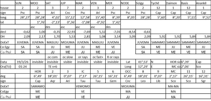 sono con Algenio natura Marte-Mercurio. Ingresso 20 marzo 2025 14h46m tu I luminari si trovano nell’ottavo luogo, la Luna è al ventunesimo grado